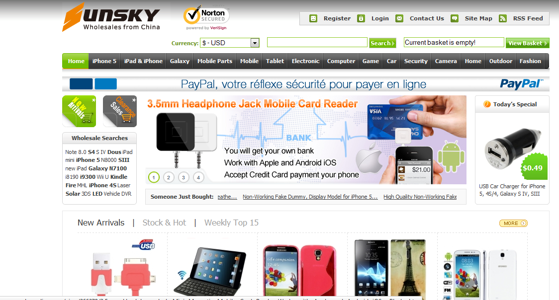 SUNSKY.COM Магазин электронных товаров и и аксессуаров,выьор просто огромен,даже самый придирчивый покупатель найдёт здесь всё что нужно,магазин ведёт как розничную торговлю ,так и оптовые продажи.Не смотря на то что отсутствует русский язык ,оплату можно производить Российскими платёжными системами Яндекс деньги и т.д,ну а что б видеть всё на родном языке ,можно просто копировать ссылку в строку браузера Google Chrom