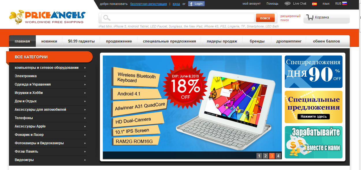 PRICEANGELS.COM Действительно приз ангелов,порой скидки в этом онлайн магазине доходят до 65%,и это не предел,основная специализация продаж -это электроника,компьютеры и сетевое оборудование,русский язык,бесплатная доставка,электронные деньги,всё что надо для приятных покупок